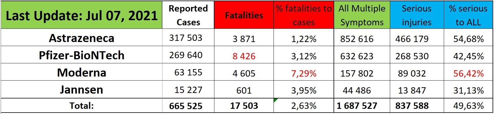 Baza danych EudraVigilance informuje, że do 3 lipca 2021 r. odnotowano 17 503 zgonów i 1687 527 rannych po wstrzyknięciu czterech eksperymentalnych zastrzyków COVID-19: