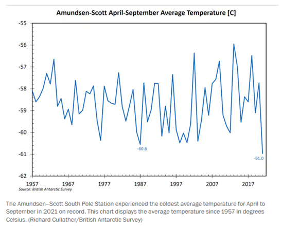 Za każdym razem, gdy temperatura osiąga rekordowy poziom lub gdy warunki są wyjątkowo suche, media zwilżają łóżko nagłówkami o zagłady, obwiniającymi zmiany klimatyczne wywołane przez człowieka. To samo nie dotyczy sytuacji, gdy jest na odwrót. Na przykład, na początku 2021 r. rekordy wszech czasów zimna zostały pobite lub powiązane w 219 lokalizacjach w centralnych stanach, od Północnej Dakoty i Wisconsin po Teksas, Arkansas i Luizjanę. W Australii listopad 2021 roku był najbardziej mokrym listopadem od 122 lat w historii, bijąc rekord ustanowiony w listopadzie 1973 roku. Nawet Antarktyda doświadczyła podobnego szoku. W 2021 r. Biegun Południowy odnotował najzimniejszą zimę od 1957 r., Przy średniej temperaturze na Biegunie Południowym Amundsen-Scott między kwietniem a wrześniem, temperatura kości spadła do -78 stopni. W rezultacie, według National Snow and Ice Data Center, poziom lodu morskiego otaczającego kontynent wzrósł w sierpniu do piątego najwyższego poziomu w historii.