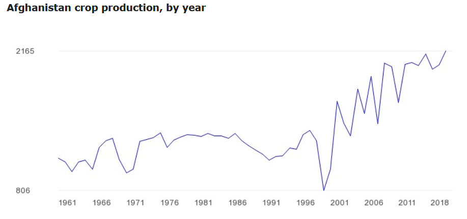 Jak donosi James Taylor , Afganistan podwoił plony w ciągu ostatnich trzech dekad, a ostatnio regularnie ustanowił rekordy produkcji.