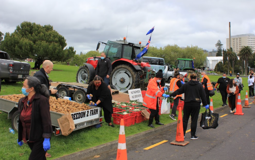 Supportive farmers with tractors brought three trailer loads of potatoes, onions, and silverbeet, and donated them to the public. Their friendly gesture united town and country folk determined to save their nation from State enforced Covid policies that bring destruction not healing.