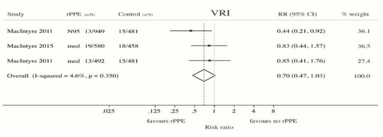 “Self-reported assessment of clinical outcomes was prone to bias. Evidence of a protective effect of masks or respirators against verified respiratory infection (VRI) was not statistically significant”; as per Fig. 2c therein: