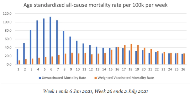 Two English gentlemen, Norman Fenton and Martin Neil, recently completed an analysis of weekly deaths in the UK from 6th January, 2021 to 2nd July, 2021 by covid vaccination status.